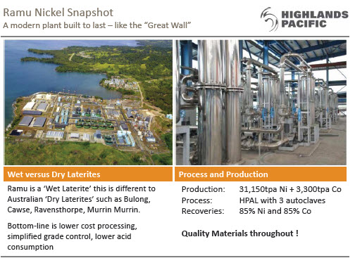Ramu as you say is a wet laterite, similar to those in The Philippines, New Caledonia and Indonesia. This means that the magnesium content is lower which assists in nickel recoveries and reduces the amount of acid used in the process, hence providing a lower operating cost environment.